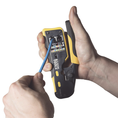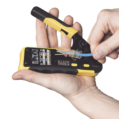 - Poncha conectores modulares de 4, 6 y 8 posiciones (conectores estándar RJ11/RJ12 y conectores RJ45 Pass-Thru™ de Klein Tools).