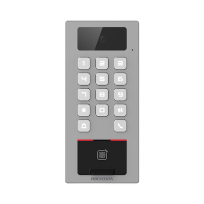 Lector de diferentes tecnologías que integra la función de TV portero la cual puede realizar una llamada a un monitor dentro del recinto y además también a una App de Smartphone a través de internet, también se puede acceder con códigos PIN generado desde el software IVMS4200, una huella o incluso una tarjeta de proximidad de tecnología MIFARE.