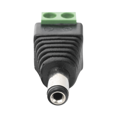 Adaptador tipo jack de 3.5 mm macho polarizado de 12 Vcc con terminales de tornillo.