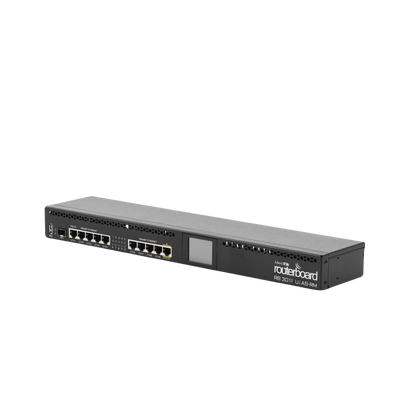 La unidad RB3011UiAS-RM viene con un gabinete de montaje en rack de 1U, un panel LCD de pantalla táctil, un puerto de consola serie y funcionalidad de salida PoE en el último puerto Ethernet.